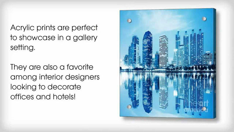 Bring your artwork to life with the stylish lines and added depth of an acrylic print. Your image gets printed directly onto the back of a 1/4" thick sheet of clear acrylic. The high gloss of the acrylic sheet complements the rich colors of any image to produce stunning results.